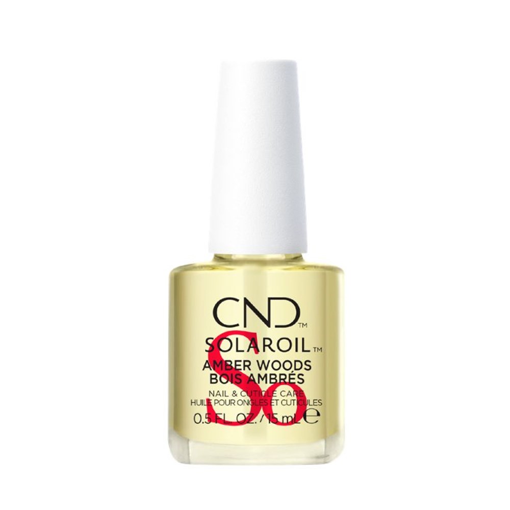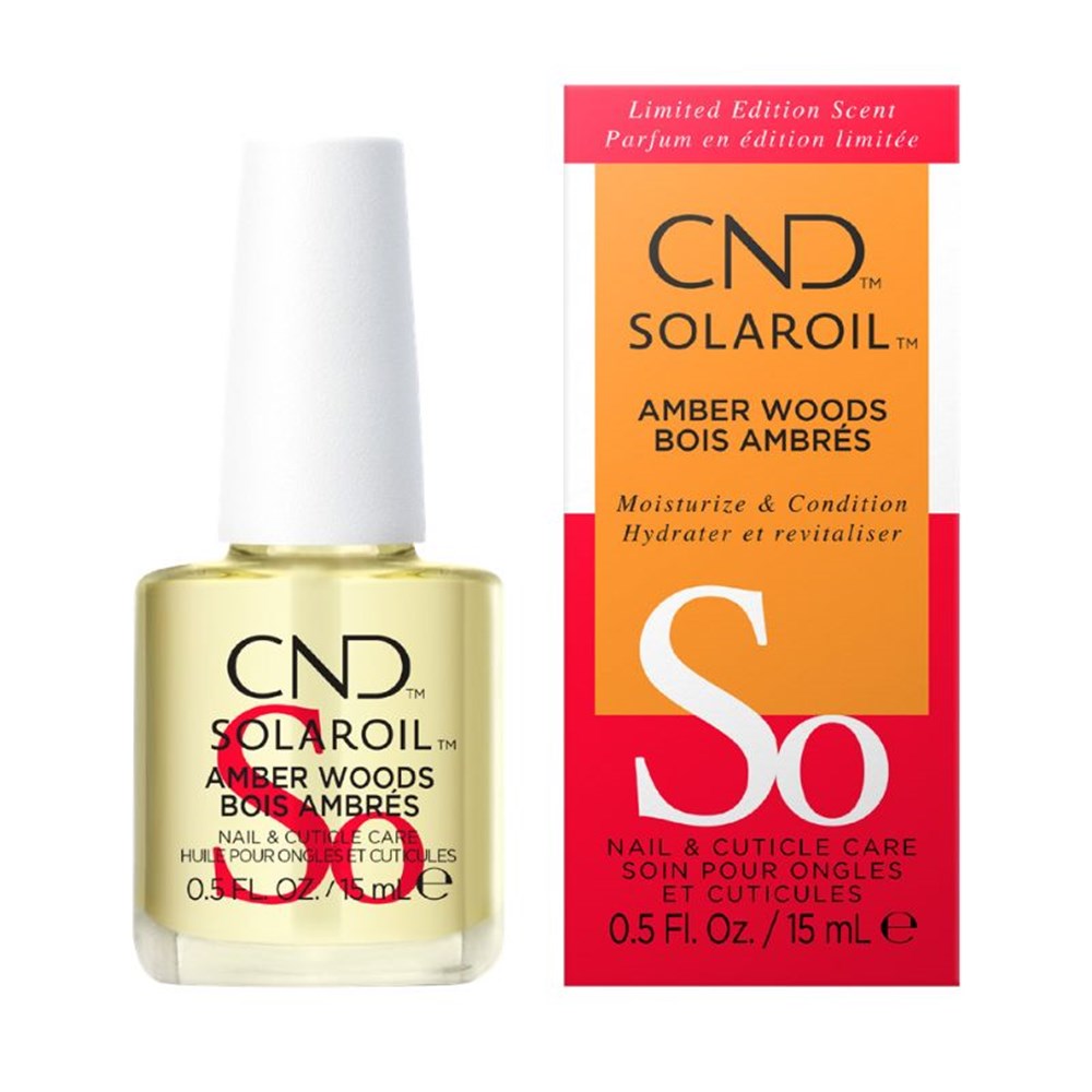 SolarOil™ Amber Woods. This limited-edition fragrance features warm, relaxing notes of sandalwood, amber, and sweet cherry, creating a soothing atmosphere while deeply conditioning the nails and skin.