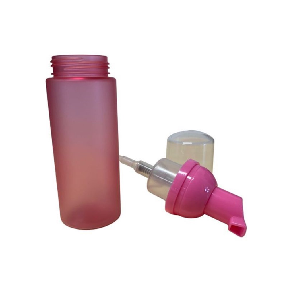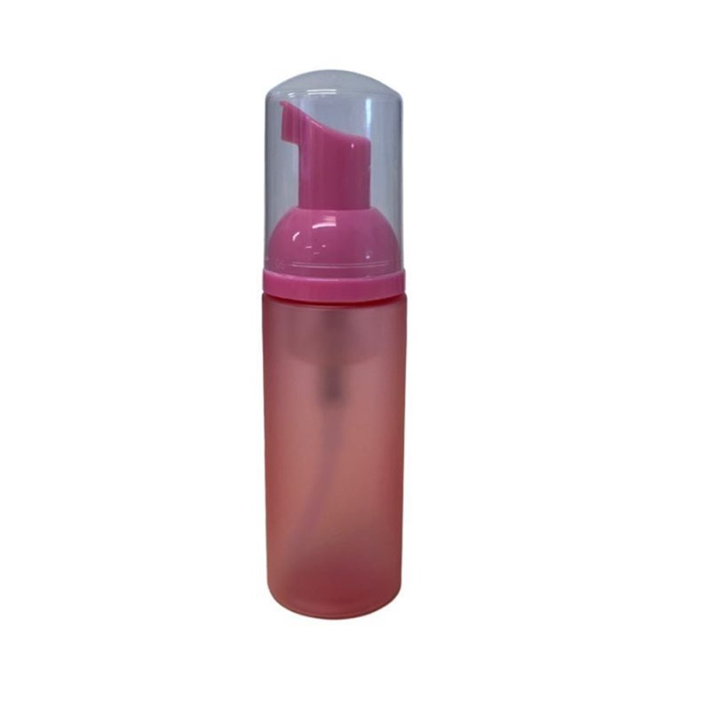 Empty Foam Pump Bottle, designed for style, functionality, and hygiene. The bottle features a 60ml frosted pink body paired with a glamorous pink pump top and a clear protective lid, creating a chic and professional aesthetic that enhances your salon’s branding.