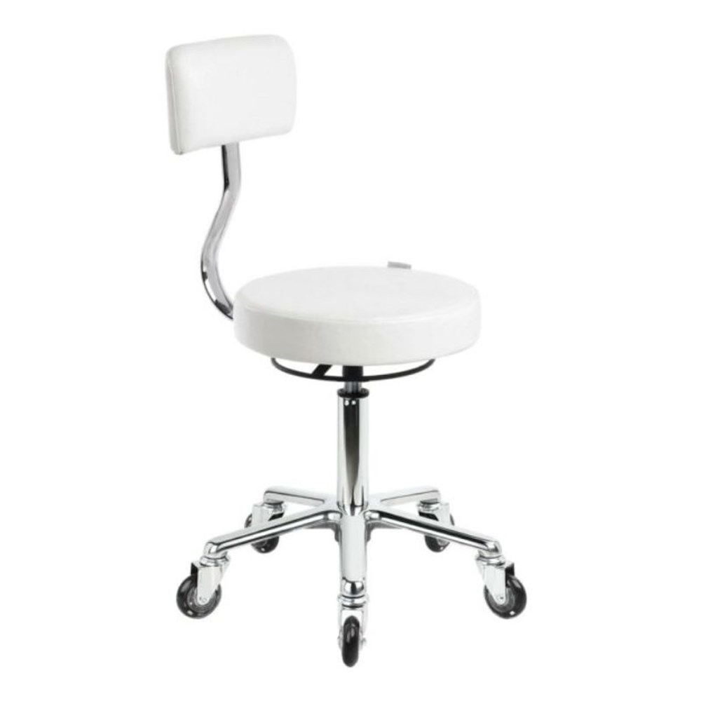 The padded round seat with supportive low backrest encourages better posture and reduces fatigue throughout the day. Upholstered in white salon-grade vinyl, it offers a clean, hygienic appearance that’s easy to wipe down and maintain.